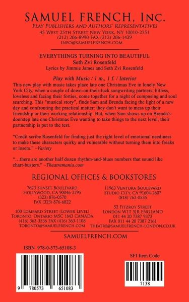 Everythings Turning Into Beautiful 1m., 1f. / Interior / Play with music This new play with music takes place late one Christmas Eve in lonely New York City, when a couple of down-on-their-luck songwriting partners, hitless, loveless and facing their forties, come together for a night of composing and soul searching. This "musical story," finds Sam and Brenda facing the light of a new day and confronting the practical matter: they don't want to mess up their friendship or their working relationship. But, when Sam shows up on Brenda's doorstep late one Christmas Eve wanting to take things to the next level, their partnership is put to the test.