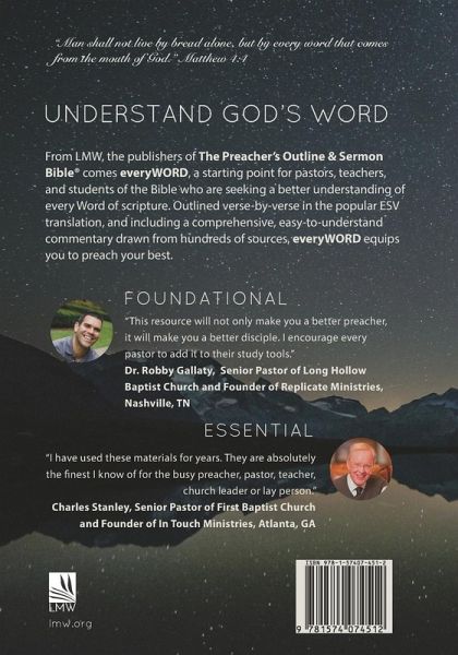 From LMW, the publishers of The Preacher's Outline & Sermon Bible comes everyWORD, a starting point for pastors, teachers, and students of the Bible who are seeking a better understanding of every Word of scripture. Outlined verse-by-verse in the popular ESV translation, and including a comprehensive, easy-to-understand commentary drawn from hundreds of sources, everyWORD equips you to preach your best.