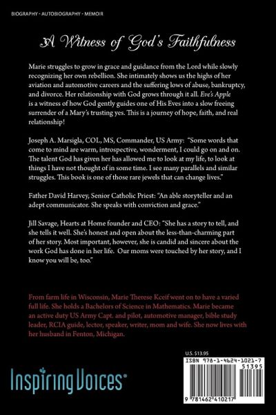 A Witness of God’s Faithfulness Marie struggles to grow in grace and guidance fromMarie struggles to grow in grace and guidance from the Lord while slowly recognizing her own rebellion. She intimately shows us the highs of her aviation and automotive careers and the suffering lows of abuse, bankruptcy, and divorce. Her relationship with God grows through it all. Eve’s Apple is a witness of how God gently guides one of His Eves into a slow freeing surrender of a Mary’s trusting yes. This is a journey of hope, faith, and real relationship! Joseph A. Marsigla, COL, MS, Commander, US Army: "Some words that come to mind are warm, introspective, wonderment, I could go on and on. The talent God has given her has allowed me to look at my life, to look at things I have not thought of in some time. I see many parallels and similar struggles. This book is one of those rare jewels that can change lives." Father David Harvey, Senior Catholic Priest: "An able storyteller and an adept communicator. She speaks with conviction and grace." Jill Savage, Hearts at Home founder and CEO: "She has a story to tell, and she tells it well. She’s honest and open about the less-than-charming part of her story. Most important, however, she is candid and sincere about the work God has done in her life. Our moms were touched by her story, and I know you will be, too."