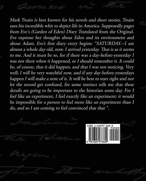 Mark Twain is best known for his novels and short stories. Twain uses his incredible whit to depict life in America. Supposedly pages from Eve's (Garden of Eden) Diary Translated from the Original. Eve expresse her thoughts about Eden and its environment and about Adam. Eve's first diary entry begins: "SATURDAY.--I am almost a whole day old, now. I arrived yesterday. That is as it seems to me. And it must be so, for if there was a day-before-yesterday I was not there when it happened, or I should remember it. It could be, of course, that it did happen, and that I was not noticing. Very well; I will be very watchful now, and if any day-before-yesterdays happen I will make a note of it. It will be best to start right and not let the record get confused, for some instinct tells me that these details are going to be important to the historian some day. For I feel like an experiment, I feel exactly like an experiment; it would be impossible for a person to feel more like an experiment than I do, and so I am coming to feel convinced that that ".