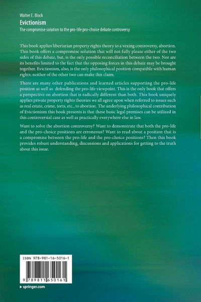 This book applies libertarian property rights theory to a vexing controversy, abortion. This book offers a compromise solution that will not fully please either of the two sides of this debate, but, is the only possible reconciliation between the two. Nor are its benefits limited to the fact that the opposing forces in this debate may be brought together. Evictionism, also, is the only philosophical position compatible with human rights; neither of the other two can make this claim.