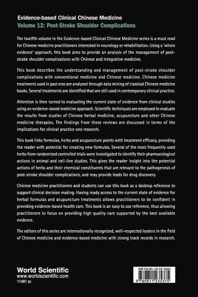 The twelve volume in the Evidence-based Clinical Chinese Medicine series is a must read for Chinese medicine practitioners interested in neurology or rehabilitation. Using a 'whole evidence' approach, this book aims to provide an analysis of the management of post-stroke shoulder complications with Chinese and integrative medicine. This book describes the understanding and management of post-stroke shoulder complications with conventional medicine and Chinese medicine. Chinese medicine treatments used in past eras are analysed through data mining of classical Chinese medicine books. Several treatments are identified that are still used in contemporary clinical practice. Attention is then turned to evaluating the current state of evidence from clinical studies using an evidence-based medicine approach. Scientific techniques are employed to evaluate the results from studies of Chinese herbal medicine, acupuncture and other Chinese medicine therapies. The findings from these reviews are discussed in terms of the implications for clinical practice and research. Chinese medicine practitioners and students can use this book as a desktop reference to support clinical decision making. Having ready access to the current state of evidence for herbal formulas and acupuncture treatments allows practitioners to be confident in providing evidence-based health care. This book is an easy to use reference, thus allowing practitioners to focus on providing high quality care supported by the best available evidence. This book links formulas, herbs and acupuncture points with treatment efficacy, providing the reader with potential for creating new formulas. Several of the most frequently used herbs from randomized controlled trials were investigated to identify their pharmacological actions in animal and cell-line studies. This gives the reader insight into the potential actions of herbs and their chemical constituents that are relevant to the pathogenesis of post-stroke shoulder complications, and may provide leads for drug discovery. The editors of this series are internationally recognized, well-respected leaders in the field of Chinese medicine and evidence-based medicine with strong track records in research.