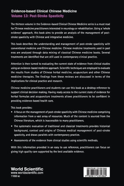 The thirteen volume in the Evidence-based Clinical Chinese Medicine series is a must read for Chinese medicine practitioners interested in neurology or rehabilitation. Using a 'whole evidence' approach, this book aims to provide an analysis of the management of post-stroke spasticity with Chinese and integrative medicine. This book describes the understanding and management of post-stroke spasticity with conventional medicine and Chinese medicine. Chinese medicine treatments used in past eras are analysed through data mining of classical Chinese medicine books. Several treatments are identified that are still used in contemporary clinical practice. Attention is then turned to evaluating the current state of evidence from clinical studies using an evidence-based medicine approach. Scientific techniques are employed to evaluate the results from studies of Chinese herbal medicine, acupuncture and other Chinese medicine therapies. The findings from these reviews are discussed in terms of the implications for clinical practice and research. Chinese medicine practitioners and students can use this book as a desktop reference to support clinical decision making. Having ready access to the current state of evidence for herbal formulas and acupuncture treatments allows practitioners to be confident in providing evidence-based health care. This book provides:A focus on the management of post-stroke spasticity with Chinese medicine comprising information from a vast array of resources. Much of the content is sourced from the Chinese literature, which is inaccessible to many practitioners. The systematic evaluation of traditional and classical treatments provides historical background, context and origins of Chinese medical management of post-stroke spasticity, and draws parallels with contemporary practice. Assessments of the evidence from clinical studies using scientific methods. With this information provided in an easy to use reference, practitioners can focus on giving high quality care supported by the best available evidence.
