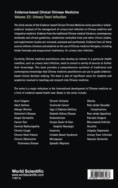 Urinary tract infection is a common clinical condition with a significant health burden. This latest volume, Vol. 22 in the Evidence-based Clinical Chinese Medicine series, uses a 'whole evidence' approach to summarise management of urinary tract infection with Chinese medicine. The first chapter provides an overview of the clinical presentation, diagnosis and treatment with conventional medicine. The conceptualisation of urinary tract infection in both contemporary and classical Chinese medicine literature is reviewed and analysed. Attention is then turned to the evidence from clinical studies. Systematic reviews, using internationally accepted scientific methods, describe the treatments tested in clinical studies and the effects of Chinese herbal medicine, acupuncture and related therapies, and combinations of these therapies for urinary tract infection. The potential mechanisms of action for some of the key herbs are summarised, based on analysis of experimental studies. The final chapter summarises the current state of evidence and offers suggestions for contemporary clinical practice and future research. This book is a handy desktop reference for both clinicians and students of Chinese and integrative medicine. It provides a comprehensive synthesis of both traditional and contemporary knowledge that can inform clinical decision-making. This book provides an in-depth analysis of Chinese medicine management of urinary tract infection.