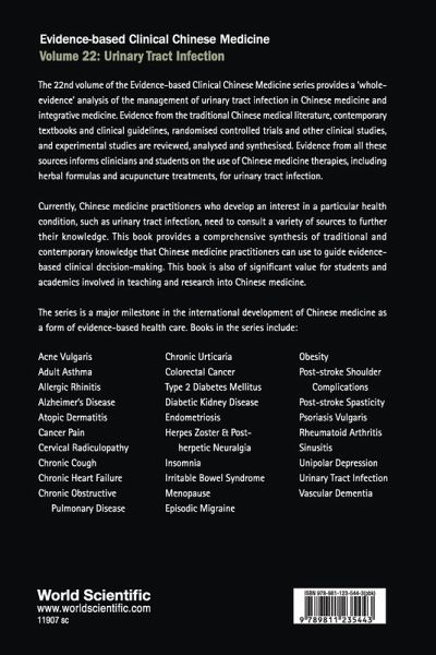 Urinary tract infection is a common clinical condition with a significant health burden. This latest volume, Vol. 22 in the Evidence-based Clinical Chinese Medicine series, uses a 'whole evidence' approach to summarise management of urinary tract infection with Chinese medicine. The first chapter provides an overview of the clinical presentation, diagnosis and treatment with conventional medicine. The conceptualisation of urinary tract infection in both contemporary and classical Chinese medicine literature is reviewed and analysed. Attention is then turned to the evidence from clinical studies. Systematic reviews, using internationally accepted scientific methods, describe the treatments tested in clinical studies and the effects of Chinese herbal medicine, acupuncture and related therapies, and combinations of these therapies for urinary tract infection. The potential mechanisms of action for some of the key herbs are summarised, based on analysis of experimental studies. The final chapter summarises the current state of evidence and offers suggestions for contemporary clinical practice and future research. This book is a handy desktop reference for both clinicians and students of Chinese and integrative medicine. It provides a comprehensive synthesis of both traditional and contemporary knowledge that can inform clinical decision-making. This book provides an in-depth analysis of Chinese medicine management of urinary tract infection.