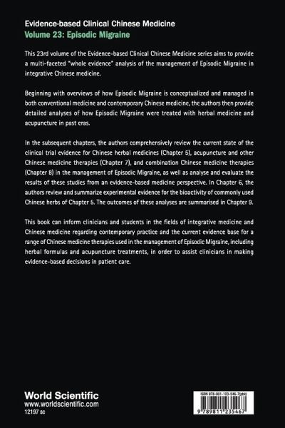 This 23rd volume of the Evidence-based Clinical Chinese Medicine series aims to provide a multi-faceted ""whole evidence"" analysis of the management of Episodic Migraine in integrative Chinese medicine. Beginning with overviews of how Episodic Migraine is conceptualized and managed in both conventional medicine and contemporary Chinese medicine, the authors then provide detailed analyses of how Episodic Migraine were treated with herbal medicine and acupuncture in past eras. In the subsequent chapters, the authors comprehensively review the current state of the clinical trial evidence for Chinese herbal medicines (Chapter 5), acupuncture and other Chinese medicine therapies (Chapter 7), and combination Chinese medicine therapies (Chapter 8) in the management of Episodic Migraine, as well as analyse and evaluate the results of these studies from an evidence-based medicine perspective. In Chapter 6, the authors review and summarize experimental evidence for the bioactivity of commonly used Chinese herbs in Chapter 6. The outcomes of these analyses are summarised and Chapter 1 Introduction to Migraine. This book can inform clinicians and students in the fields of integrative medicine and Chinese medicine regarding contemporary practice and the current evidence base for a range of Chinese medicine therapies used in the management of Episodic Migraine, including herbal formulas and acupuncture treatments, in order to assist clinicians in making evidence-based decisions in patient care.