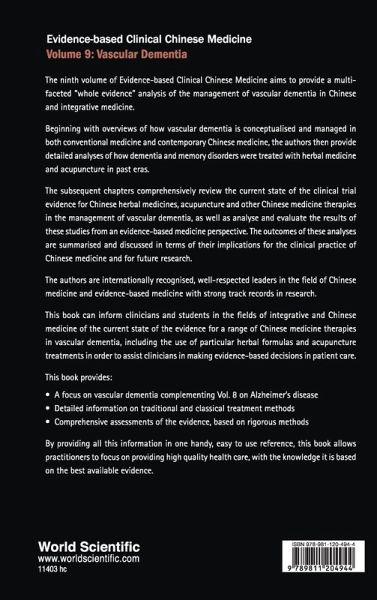 The ninth volume of Evidence-based Clinical Chinese Medicine aims to provide a multi-faceted "whole evidence" analysis of the management of vascular dementia in Chinese and integrative medicine. Beginning with overviews of how vascular dementia is conceptualized and managed in both conventional medicine and contemporary Chinese medicine, the authors then provide detailed analyses of how dementia and memory disorders were treated with herbal medicine and acupuncture in past eras. The subsequent chapters comprehensively review the current state of the clinical trial evidence for Chinese herbal medicines, acupuncture and other Chinese medicine therapies in the management of vascular dementia, as well as analyse and evaluate the results of these studies from an evidence-based medicine perspective. The outcomes of these analyses are summarised and discussed in terms of their implications for the clinical practice of Chinese medicine and for future research. The authors are internationally recognized, well-respected leaders in the field of Chinese medicine and evidence-based medicine with strong track records in research. This book can inform clinicians and students in the fields of integrative and Chinese medicine of the current state of the evidence for a range of Chinese medicine therapies in vascular dementia, including the use of particular herbal formulas and acupuncture treatments in order to assist clinicians in making evidence-based decisions in patient care. This book provides: A focus on vascular dementia complementing Vol 8 on Alzheimer's disease Detailed information on traditional and classical treatment methods Comprehensive assessments of the evidence, based on rigorous methods By providing all this information in one handy, easy to use reference, this book allows practitioners to focus on providing high quality health care, with the knowledge it is based on the best available evidence.