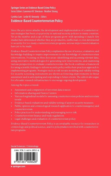 Preface: Evidence-based policy movement.- A. Introduction.- 1. Evidence Based Counter Terrorism Policy: Issues and Prospects.- B. Obtaining Data for Counterterrorism Evaluations.- 2. Generating Evidence - A Review of Projects from the START Center .- 3. Data Archives for Terrorism Research.- 4. The Role of Fusion Centers as Sources of Information .- 5. Data from courts and prisons.- 6. Dynamic Data Analysis and Data Mining.- C. Methodological Concerns in Evaluating Counterterrorism Policy.- 7. Methodological Challenges of Evaluation: The Qualitative Critique of the Campbell Review.- 8. Quantitative Methods in Evaluating Counterterrorism policy.- 9. Longitudinal Methods of Evaluation: Hazard Modeling and Trajectory Analysis.- 10. Alternative Methods of Evaluation - Advanced Events Data Analysis and Simulations