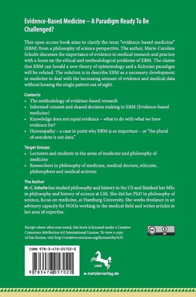 This open access book aims to clarify the term "evidence-based medicine" (EBM) from a philosophy of science perspective. The author, Marie-Caroline Schulte discusses the importance of evi-dence in medical research and practice with a focus on the ethical and methodological prob-lems of EBM. The claims that EBM can herald a new theory of epistemology and a Kuhnian paradigm will be refuted. The solution is to describe EBM as a necessary development in medicine to deal with the increasing amount of evidence and medical data without loosing the single patient out of sight.