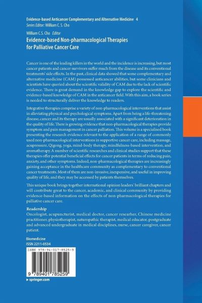 Integrative therapies comprise a variety of non-pharmacological interventions that assist in alleviating physical and psychological symptoms. Apart from being a life-threatening disease, cancer and its therapy are usually associated with a significant deterioration in the quality of life. There is growing evidence that non-pharmacological therapies provide symptom and pain management in cancer palliation. This volume is a specialised book presenting the research evidence relevant to the application of a range of commonly used non-pharmacological interventions in supportive cancer care, including massage, acupressure, Qigong, yoga, mind-body therapy, mindfulness-based intervention, and aromatherapy. A number of scientific researches and clinical studies support that these therapies offer potential beneficial effects for cancer patients in terms of reducing pain, anxiety, and other symptoms. Indeed, non-pharmacological therapies are increasingly gaining acceptance in the healthcare community as complementary to conventional cancer treatments. Most of them are non-invasive, inexpensive, and useful in improving quality of life, and they may be accessed by patients themselves.