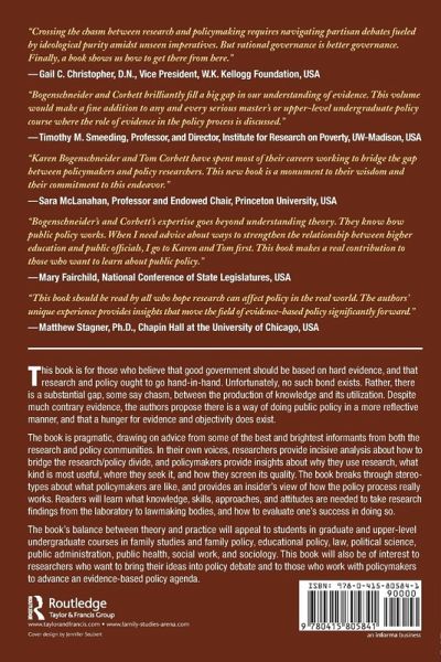 This book is for those who believe that good government should be based on hard evidence, and that research and policy ought to go hand-in-hand. Unfortunately, no such bond exists. Rather, there is a substantial gap, some say chasm, between the production of knowledge and its utilization. Despite much contrary evidence, the authors propose there is a way of doing public policy in a more reflective manner, and that a hunger for evidence and objectivity does exist. ¿ The book is pragmatic, drawing on advice from some of the best and brightest informants from both the research and policy communities. In their own voices, researchers provide incisive analysis about how to bridge the research/policy divide, and policymakers provide insights about why they use research, what kind is most useful, where they seek it, and how they screen its quality. The book breaks through stereotypes about what policymakers are like, and provides an insiders' view of how the policy process really works. Readers will learn what knowledge, skills, approaches, and attitudes are needed to take research findings from the laboratory to lawmaking bodies, and how to evaluate one's success in doing so. ¿ The book's balance between theory and practice will appeal to students in graduate and upper-level undergraduate courses in family studies and family policy, educational policy, law, political science, public administration, public health, social work, and sociology. This book will also be of interest to researchers who want to bring their ideas into policy debate and to those who work with policymakers to advance an evidence-based policy agenda.