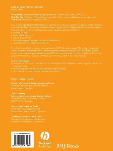 The Evidence-based Practice Workbook is an ideal tool for use by GPs, medical specialists and other healthcare professionals to learn the concepts of evidence-based practice (EBP). Practical and interactive, this workbook provides simple methods to help health professionals find and use the best evidence to answer clinical questions, developing their skills in: * asking clinical questions * searching for answers * discriminating good from poor information and research * using the answers to make clinical decisions. This attractive, colour workbook provides a clear explanation of EBP skills and concepts. Written by internationally respected authors, this expanded and updated edition has been developed from evidence-based practice workshops run by the Centre for Evidence-Based Medicine at the University of Queensland and Oxford, and contains information and exercises to help health professionals learn how to use EBP in their clinical practice.