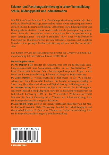 Evidenzorientierung im Bildungssystem als Forschungsgegenstand.- Evidenzorientierung in der Lehrkräfte-bildung.- Forschende Haltung und Kompetenz von Lehramtsstudierenden.- Förderung evidenzorientierten Problem-lösens in der Lehramtsausbildung.- Verwendung von Evidenz in der Schulpraxis.- Das Clearing House Unterricht.- Forschungs- und Evidenzbasierung in Schulen.- Ist die Berufserfahrung ein geeignetes Einstellungskriterium für Fortbildende? - Effektivität und Akzeptanz von erneuten Unterrichtsbeobachtungen bei niedersächsischen Schulinspektionen. - "Data Richness" als Merkmal erfolgreicher Schulen.- Wie hilfreich kann die empirische Schul- und Unterrichtsforschung für die Unterrichtsentwicklung an einer Schule sein? - Wissen und Wissenslücken.- Auswirkungen institutioneller Regelungskontexte und Eigenlogiken schulischer Organisationen auf evidenzbasierte Schulentwicklung.- Transferarbeit von Landesinstituten als "Evidenzverarbeitung".- "Damit man eben wegkommt von: Der Schulträger spricht mit einzelnen Schulen und wer am lautesten quengelt, kriegt am meisten." - Forschungs- und Evidenzorientierung in der Bildungspolitik und -administration.