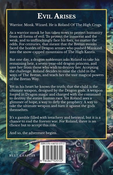 Warrior. Monk. Wizard. He is Roland Of The High Crags. As a warrior monk he has taken vows to protect humanity from all forms of evil. To protect the innocent and the weak, and to unflinchingly face his foes, no matter the odds. For centuries, that meant that the Bretan monks faced the hordes of Dragon armies who pushed Mankind into the snow-capped mountains of The High Kanris. But one day, a dragon nobleman asks Roland to take his remaining heir, a seven-year-old dragon princess, and save her from those who wish to destroy her. Accepting the challenge, Roland decides to raise the child in the ways of The Bretan, and teach her the vast magical powers of the Bretan Way. Yet in his heart he knows the truth; that the child is the ultimate weapon, designed by the Dragon gods. A weapon forged in Dragon magic and charged with the command to destroy the entire human race. Yet Roland sees a glimmer of hope, a way to defy the prophecy. A way to take the ultimate weapon and turn it against the gods themselves. It's a gamble filled with treachery and betrayal, but it is a chance to end the forever war. For Roland, there is no choice but to accept this role. And so, the adventure begins.