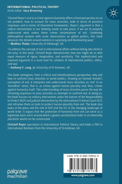 This book seeks to reimagine why and how to confront mass atrocities in world politics. Drawing on Hannah Arendt's conception of evil, it interprets and understands mass atrocities as 'evil' in an 'Arendtian' sense, that is, as crimes against human plurality and, thus, crimes against humanity itself. This understanding of mass atrocities paves the way for reframing responses to mass atrocities as attempts to confront evil. In doing so, the book focuses on military intervention under the banner of the Responsibility to Protect (R2P) and judicial intervention by the International Criminal Court (ICC) and reframes them as tools to protect human plurality from evil. Furthermore, the book looks at the place and the role of R2P and the ICC in the changing landscape of world order. It argues that the protection of humanity from evil can serve as a legitimate Grundnorm (basic norm) around which a global constitutional order in an inherently pluralistic world can be constructed.