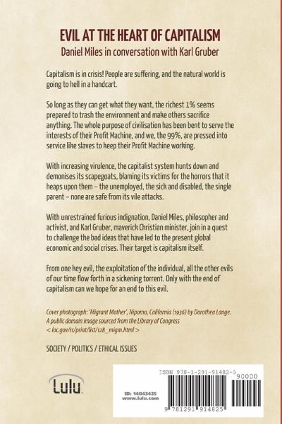 Capitalism is in crisis! People are suffering, and the natural world is going to hell in a handcart. So long as they can get what they want, the richest 1%% seems prepared to trash the environment and make others sacrifice anything. The whole purpose of civilisation has been bent to serve the interests of their Profit Machine, and we, the 99%%, are pressed into service like slaves to keep their Profit Machine working. With increasing virulence, the capitalist system hunts down and demonises its scapegoats, blaming its victims for the horrors that it heaps upon them - the unemployed, the sick and disabled, the single parent - none are safe from its vile attacks. With unrestrained furious indignation, Daniel Miles, philosopher and activist, and Karl Gruber, maverick Christian minister, join in a quest to challenge the bad ideas that have led to the present global economic and social crises. From one key evil, the exploitation of the individual, all the other evils of our time flow forth in a sickening torrent.