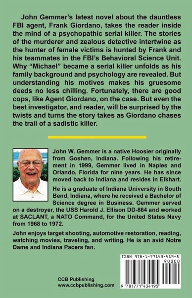 John Gemmer's latest novel about the dauntless FBI agent, Frank Giordano, takes the reader inside the mind of a psychopathic serial killer. The stories of the murderer and zealous detective intertwine as the hunter of female victims is hunted by Frank and his teammates in the FBI's Behavioral Science Unit. Why "Michael" became a serial killer unfolds as his family background and psychology are revealed. But understanding his motives makes his gruesome deeds no less chilling. Fortunately, there are good cops, like Agent Giordano, on the case. But even the best investigator, and reader, will be surprised by the twists and turns the story takes as Giordano chases the trail of a sadistic killer. About the Author: John W. Gemmer is a native Hoosier originally from Goshen, Indiana. Following his retirement in 1999, Gemmer lived in Naples and Orlando, Florida for nine years. He has since moved back to Indiana and resides in Elkhart. He is a graduate of Indiana University in South Bend, Indiana, where he received a Bachelor of Science degree in Business. Gemmer served on a destroyer, the USS Harold J. Ellison DD-864 and worked at SACLANT, a NATO Command, for the United States Navy from 1968 to 1972. John enjoys target shooting, automotive restoration, reading, watching movies, traveling, and writing. He is an avid Notre Dame and Indiana Pacers fan.