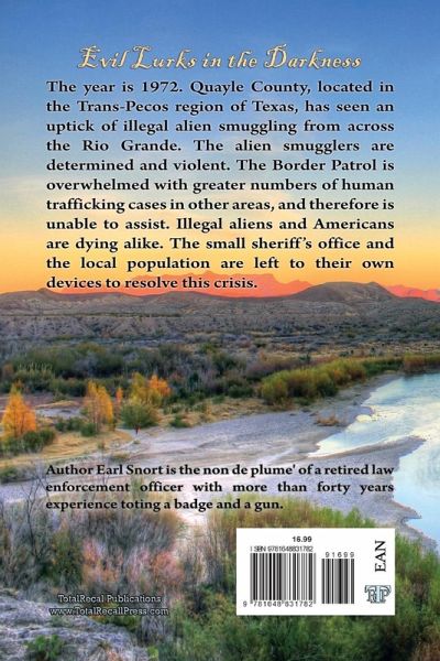 Evil Lurks In The Darkness Even When Strong Men Stand Watch The year is 1972. Quayle County, located in the Trans-Pecos region of Texas, has seen an uptick of illegal alien smuggling from across the Rio Grande. The alien smugglers are determined and violent. The Border Patrol is overwhelmed with greater numbers of human trafficking cases in other areas, and therefore is unable to assist. Illegal aliens and Americans are dying alike. The small sheriff's office and the local population are left to their own devices to resolve this crisis. Once again, Sheriff Solomon Pratt, Deputy Barlow Adams, Deputy Slick Oldman, retired Deputy Archie Willis, plus the new rookie, Deputy E.M. Gillespie, and the rest of the staff on the Quayle County Sheriff's Office rise to the occasion to vanquish the threat.