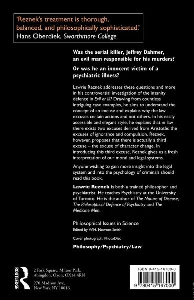 Lawrie Reznek addresses these questions and more in his controversial investigation of the insanity defense in Evil or Ill? Drawing from countless intriguing case examples, he aims to understand the concept of an excuse, and explains why the law excuses certain actions and not others. In his easily accessible and elegant style, he explains that in law, there exists two excuses derived from Aristotle: the excuses of ignorance and compulsion. Reznek, however proposes a third excuse - the excuse of character change. In introducing this third excuse, Reznek raises a controversial possibility - the abolition of the insanity defence.