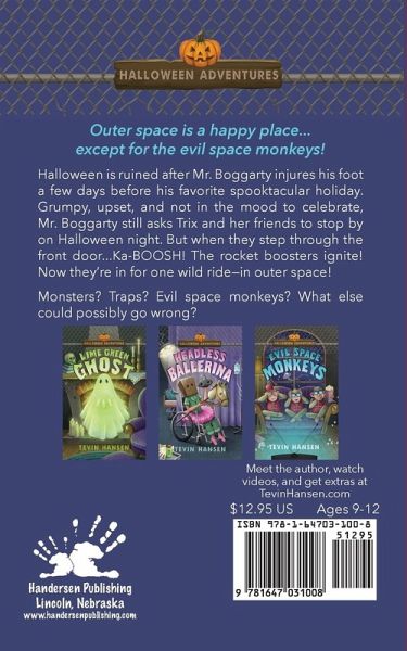 Outer space is a happy place...except for the evil space monkeys! Halloween is ruined after Mr. Boggarty injures his foot just a few days before his favorite spooktacular holiday of the year. Grumpy, upset, and not in the mood to celebrate, Mr. Boggarty still asks Trix and her friends to stop by on Halloween night...but warns them not to come inside the house. Ignoring the ominous message, Trix and her friends step through the front door and...Ka-BOOSH! The rocket boosters ignite! Now they're in for one wild ride-in outer space! Come on up to the haunted house! A terrifying place filled with all kinds of tricks, traps, evil space monkeys, and a terrifying seven-foot-tall, six-armed monster that stalks through Mr. Boggarty's humongous, fun-filled house. Monsters? Traps? Evil space monkeys? What else could possibly go wrong? The spooky adventure starts here - order now! A perfect fit for fans of: Dan Gutman, Roald Dahl, Magic Tree House, Zoey and Sassafras, Legend of the Star Runner, Isadora Moon, Harriet the Spy, Nate the Great, Case Closed, A to Z Mysteries, Dory Fantasmagory, The Princess in Black, Dragon Masters, or Junkyard Adventures book series.