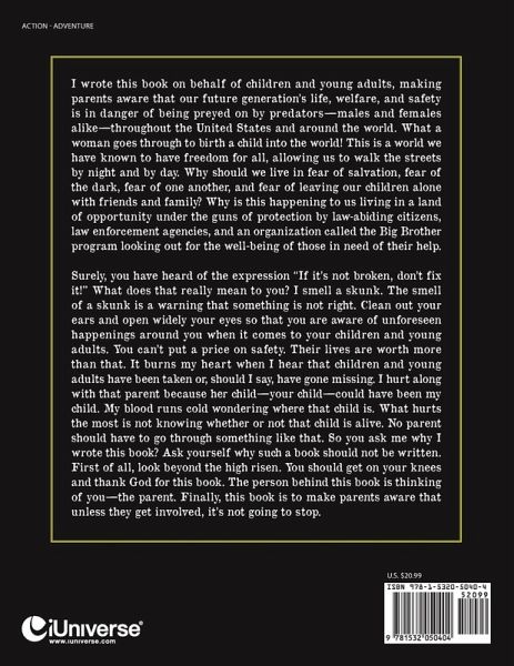 I wrote this book on behalf of children and young adults, making parents aware that our future generations life, welfare, and safety is in danger of being preyed on by predatorsmales and females alikethroughout the United States and around the world. What a woman goes through to birth a child into the world! This is a world we have known to have freedom for all, allowing us to walk the streets by night and by day. Why should we live in fear of salvation, fear of the dark, fear of one another, and fear of leaving our children alone with friends and family? Why is this happening to us while living in a land of opportunity under the guns and protection of law-abiding citizens, law enforcement agencies, and an organization called the Big Brother program thats looking out for the well-being of those in need of their help? Surely, you have heard of the expression If its not broken, dont fix it! What does that really mean to you? I smell a skunk. The smell of a skunk is a warning that something is not right. Clean out your ears, and open your eyes widely so that you are aware of unforeseen happenings around you when it comes to your children and young adults. You cant put a price on safety. Their lives are worth more than that. It burns my heart when I hear that children and young adults have been taken or, should I say, have gone missing. I hurt along with that parent because her childyour childcould have been my child. My blood runs cold wondering where that child is. What hurts the most is not knowing whether or not that child is alive. No parent should have to go through something like that. So you ask me why I wrote this book? Ask yourself why such a book should not be written. First of all, look beyond the high risen. You should get on your knees and thank God for this book. The person behind this book is thinking of youthe parent. Finally, this book is to make parents aware that unless they get involved, its not going to stop.