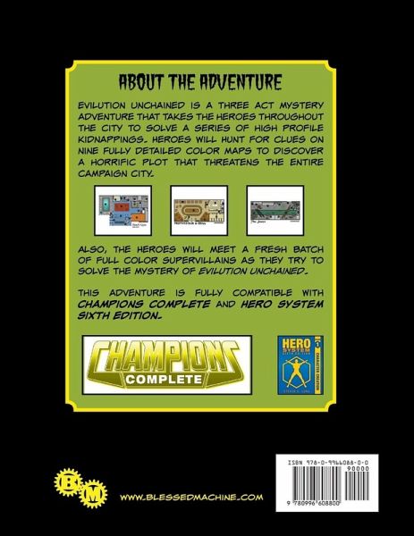 Evilution Unchained is a three act mystery adventure that takes the heroes throughout the city to solve a series of high profile kidnappings. Heroes will hunt for clues on nine fully detailed color maps to discover a horrific plot that threatens the entire campaign city.Also, the heroes will meet a fresh batch of supervillains as they try to solve the mystery of Evilution Unchained.This adventure is fully compatible with Champions Complete and the Hero System Sixth Edition rulebooks. What's Inside: This 144 page full-color adventure book includes a 48 page adventure along with supporting cardboard heroes, top-down tokens and nine maps to cut and paste together for exploring or combat.