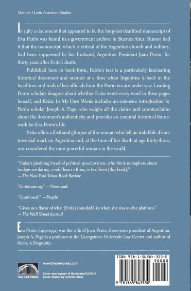 In 1987, a small Argentine publishing house published a document that had recently been found in a government archive in Buenos Aires. The document was called "Mi mensaje", or "My Message", and appeared to be the long-lost deathbed manuscript of Eva Peron, referred to by her and mentioned in several biographies of her. Rumor had it that the document, which is critical of the Argentine church and military, had been suppressed for thirty years after her death by her husband, Argentine President Juan Peron. Like everything about Evita, "My Message" is shrouded in mystery and myth. Leading Peron scholars disagree about whether Evita wrote every word herself and about whether it is an accurate reflection of Evita's thinking at the time of her death. Her estate, however, insists that the work is not by Evita. In In My Own Words, "My Message" appears in English for the first time, published with an extensive introduction by Peron scholar Joseph A. Page, who weighs all the claims and counterclaims about the document's authenticity and concludes that "My Message" is "a vital document...probably based in part on dictation by the wife of Argentine President Juan Peron".