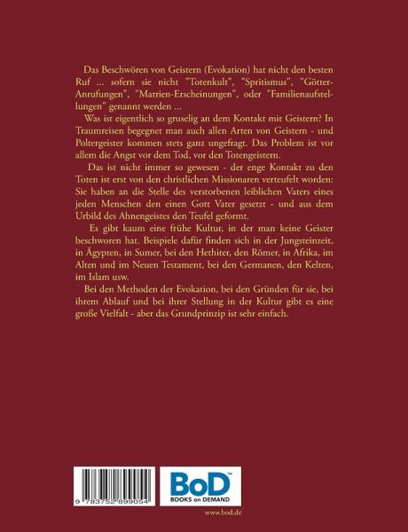 Das Beschwören von Geistern (Evokation) hat nicht den besten Ruf... sofern sie nicht "Marien-Erscheinungen", "Totenkult", "Götter-Anrufungen", "Spiritismus" oder "Familienaufstellungen" genannt werden.Was ist eigentlich so gruselig an dem Kontakt mit Geistern? In Traumreisen begegnet man auch allen Arten von Geistern - und Poltergeister kommen stets ganz ungefragt. Das Problem ist vor allem die Angst vor dem Tod, vor den Totengeistern. Das ist nicht immer so gewesen - der enge Kontakt zu den Toten ist erst von den christlichen Missionaren verteufelt worden: Sie haben an die Stelle des verstorbenen leiblichen Vaters eines jeden Menschen den einen Gott Vater gesetzt - und aus dem Urbild des Ahnengeistes den Teufel geformt. Es gibt kaum eine frühe Kultur, in der man keine Geister beschworen hat. Beispiele dafür finden sich in der Jungsteinzeit, in Ägypten, Sumer, bei den Hethiter, den Römern, in Afrika, im Alten und im Neuen Testament, bei den Germanen, den Kelten, im Islam usw. Bei den Methoden der Evokation, bei den Gründen für sie, bei ihrem Ablauf und bei ihrer Stellung in der Kultur gibt es eine große Vielfalt - aber das Grundprinzip ist sehr einfach.