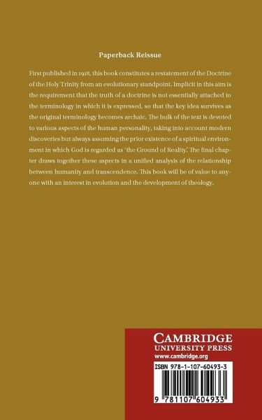 First published in 1918, this book constitutes a restatement of the Doctrine of the Holy Trinity from an evolutionary standpoint. Implicit in this aim is the requirement that the truth of a doctrine is not essentially attached to the terminology in which it is expressed, so that the key idea survives as the original terminology becomes archaic. The bulk of the text is devoted to various aspects of the human personality, taking into account modern discoveries but always assuming the prior existence of a spiritual environment in which God is regarded as 'the Ground of Reality'. The final chapter draws together these aspects in a unified analysis of the relationship between humanity and transcendence. This book will be of value to anyone with an interest in evolution and the development of theology.