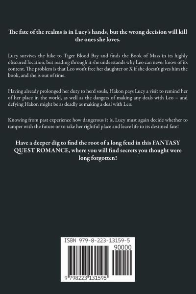 The fate of the realms is in Lucy's hands, but the wrong decision will kill the ones she loves. Lucy survives the hike to Tiger Blood Bay and finds the Book of Mass in its highly obscured location, but reading through it she understands why Leo can never know of its content. The problem is that Leo won't free her daughter or X if she doesn't gives him the book, and she is out of time. Having already prolonged her duty to herd souls, Hakon pays Lucy a visit to remind her of her place in the world, as well as the dangers of making any deals with Leo - and defying Hakon might be as deadly as making a deal with Leo. Knowing from past experience how dangerous it is, Lucy must again decide whether to tamper with the future or to take her rightful place and leave life to its destined fate! Have a deeper dig to find the root of a long feud in this FANTASY QUEST ROMANCE, where you will find secrets you thought were long forgotten!