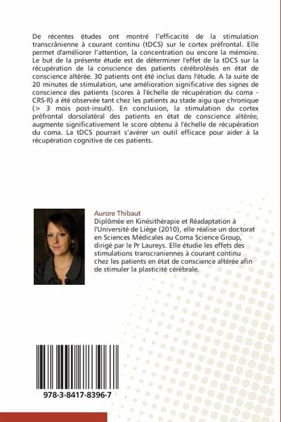De récentes études ont montré l'efficacité de la stimulation transcrânienne à courant continu (tDCS) sur le cortex préfrontal. Elle permet d'améliorer l'attention, la concentration ou encore la mémoire. Le but de la présente étude est de déterminer l'effet de la tDCS sur la récupération de la conscience des patients cérébrolésés en état de conscience altérée. 30 patients ont été inclus dans l'étude. A la suite de 20 minutes de stimulation, une amélioration significative des signes de conscience des patients (scores à l'échelle de récupération du coma - CRS-R) a été observée tant chez les patients au stade aigu que chronique ( 3 mois post-insult). En conclusion, la stimulation du cortex préfrontal dorsolatéral des patients en état de conscience altérée, augmente significativement le score obtenu à l'échelle de récupération du coma. La tDCS pourrait s'avérer un outil efficace pour aider à la récupération cognitive de ces patients.