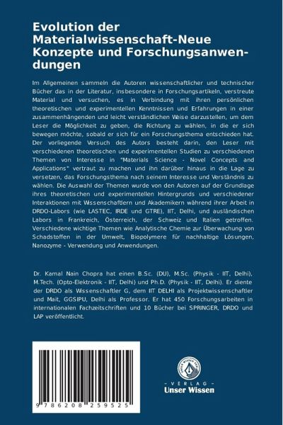 Im Allgemeinen sammeln die Autoren wissenschaftlicher und technischer Bücher das in der Literatur, insbesondere in Forschungsartikeln, verstreute Material und versuchen, es in Verbindung mit ihren persönlichen theoretischen und experimentellen Kenntnissen und Erfahrungen in einer zusammenhängenden und leicht verständlichen Weise darzustellen, um dem Leser die Möglichkeit zu geben, die Richtung zu wählen, in die er sich bewegen möchte, sobald er sich für ein Forschungsthema entschieden hat. Der vorliegende Versuch des Autors besteht darin, den Leser mit verschiedenen theoretischen und experimentellen Studien zu verschiedenen Themen von Interesse in "Materials Science - Novel Concepts and Applications" vertraut zu machen und ihn darüber hinaus in die Lage zu versetzen, das Forschungsthema nach seinem Interesse und Verständnis zu wählen. Die Auswahl der Themen wurde von den Autoren auf der Grundlage ihres theoretischen und experimentellen Hintergrunds und verschiedener Interaktionenmit Wissenschaftlern und Akademikern während ihrer Arbeit in DRDO-Labors (wie LASTEC, IRDE und GTRE), IIT, Delhi, und ausländischen Labors in Frankreich, Österreich, der Schweiz und Italien getroffen. Verschiedene wichtige Themen wie Analytische Chemie zur Überwachung von Schadstoffen in der Umwelt, Biopolymere für nachhaltige Lösungen, Nanozyme - Verwendung und Anwendungen.