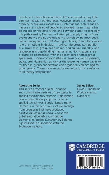 Scholars of international relations (IR) and evolution pay little attention to each other's fields. However, there is a need to examine evolution's impacts in IR. International actors such as nations are made up of people, so evolved human nature has an impact on relations within and between states. Accordingly, this pathbreaking Element will attempt to apply insights from evolutionary biology, evolutionary psychology, neuroscience, and archaeogenetics to IR. Among such insights are the evolved role of emotions in decision-making, intergroup competition as a driver of in-group cooperation, and culture, morality, and language as group-binding mechanisms. Homo sapiens is a primate, so comparison with the behaviours of other great apes reveals some commonalities in terms of group dynamics, status, and hierarchies, as well as the enduring human capacity for both in-group cooperation and organised violence against other groups. These have an evolutionary basis that is relevant to IR theory and practice.