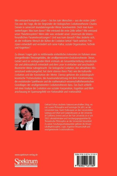 Wie entstand komplexes Leben - bis hin zum Menschen - aus der ersten Zelle? Das war die Frage, die der Begründer der biologischen Evolutionstheorie Charles Darwin in seinerzeit skandalerregender Weise beantwortete. Doch man kann weiterfragen: Was kam davor? Wie entstand die erste Zelle selber? Wie entstand unser Planetensystem? Wem oder was verdankt unser Universum die lebensfreundlichen Parametersetzungen? Und was kam danach? Was änderte sich, als der zivilisierte Mensch die Bühne der Evolution betrat? Nach welchen Prinzipien entwickelt und verändert sich seine Kultur, soziale Organisation, Technik und Kognition? Zu diesen Fragen gibt es mittlerweise einheitliche Antworten im Rahmen eines übergreifenden Theoriegebildes, der verallgemeinerten Evolutionstheorie. Dieses Gebiet wird im vorliegenden Werk erstmals als Gesamtdarstellung interdisziplinär und philosophisch entwickelt und dem Leser in einfacher und anschaulich illustrierter Weise nahegebracht. Die biologische Evolution, den aktuellsten Wissensstand widerspiegelnd, hat darin ebenso ihren Platz wie die kulturelle Evolution und die Konzeption der Meme. Ebenso gehören die präbiologisch-kosmische Protoevolution, die Auseinandersetzung mit dem Kreationismus, die evolutionäre Spieltheorie und die mathematisch-wissenschaftstheoretischen Grundlagen der verallgemeinerten Evolutionstheorie dazu. Das Buch schließt mit einer Analyse der Evolution von sozialer Koope-ration, Kognition und Weltanschauung im Spannungsfeld von Rationalität und Irrationalität.