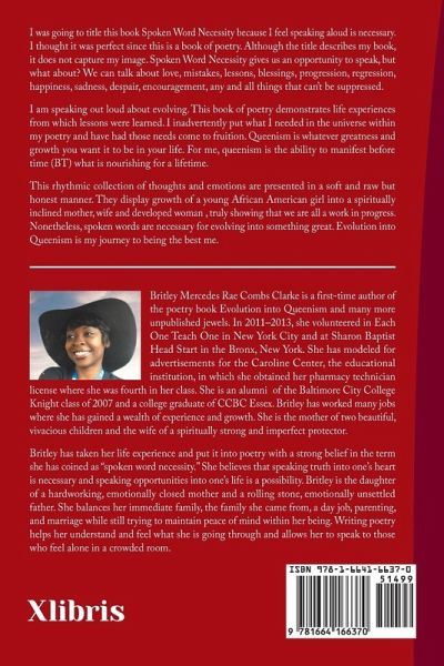 I was going to title this book Spoken Word Necessity because I feel speaking aloud is necessary. I thought it was perfect since this is a book of poetry. Although the title describes my book, it does not capture my image. Spoken Word Necessity gives us an opportunity to speak, but what about? We can talk about love, mistakes, lessons, blessings, progression, regression, happiness, sadness, despair, encouragement, any and all things that can't be suppressed. I am speaking out loud about evolving. This book of poetry demonstrates life experiences from which lessons were learned. I inadvertently put what I needed in the universe within my poetry and have had those needs come to fruition. Queenism is whatever greatness and growth you want it to be in your life. For me, queenism is the ability to manifest before time (BT) what is nourishing for a lifetime. This rhythmic collection of thoughts and emotions are presented in a soft and raw but honest manner. They display growth of a young African American girl into a spiritually inclined mother, wife and developed woman , truly showing that we are all a work in progress. Nonetheless, spoken words are necessary for evolving into something great. Evolution into Queenism is my journey to being the best me.