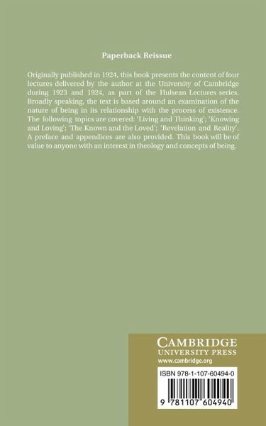Originally published in 1924, this book presents the content of four lectures delivered by the author at the University of Cambridge during 1923 and 1924, as part of the Hulsean Lectures series. Broadly speaking, the text is based around an examination of the nature of being in its relationship with the process of existence. The following topics are covered: 'Living and Thinking'; 'Knowing and Loving'; 'The Known and the Loved'; 'Revelation and Reality'. A preface and appendices are also provided. This book will be of value to anyone with an interest in theology and concepts of being.