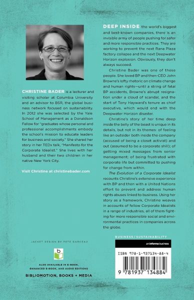 Christine Bader is a sought-after speaker, lecturer, and advisor on corporate responsibility. She is a Human Rights Advisor to BSR and a Member of the Council on Foreign Relations. She serves on the boards of the Business & Human Rights Resource Centre and The OpEd Project. Her work with BP from 1999 until 2008 brought her to Indonesia, China, and the U.K., managing the social impacts of some of the companys largest projects in the developing world. Christine has published numerous op-eds and articles and given talks to conferences, companies, and universities around the world, including a TEDx talk entitled Manifesto for the Corporate Idealist. She lives in her native New York City with her husband and two children.
