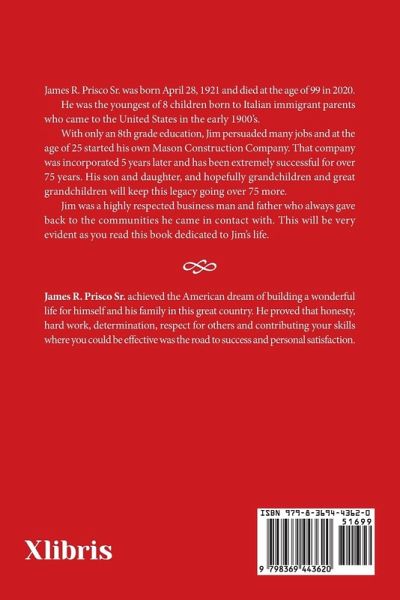 James R. Prisco Sr. was born April 28, 1921 and died at the age of 99 in 2020. He was the youngest of 8 children born to Italian immigrant parents who came to the United States in the early 1900's. With only an 8th grade education, Jim persuaded many jobs and at the age of 25 started his own Mason Construction Company. That company was incorporated 5 years later and has been extremely successful for over 75 years. His son and daughter, and hopefully grandchildren and great grandchildren will keep this legacy going over 75 more. Jim was a highly respected business man and father who always gave back to the communities he came in contact with. This will be very evident as you read this book dedicated to Jim's life.
