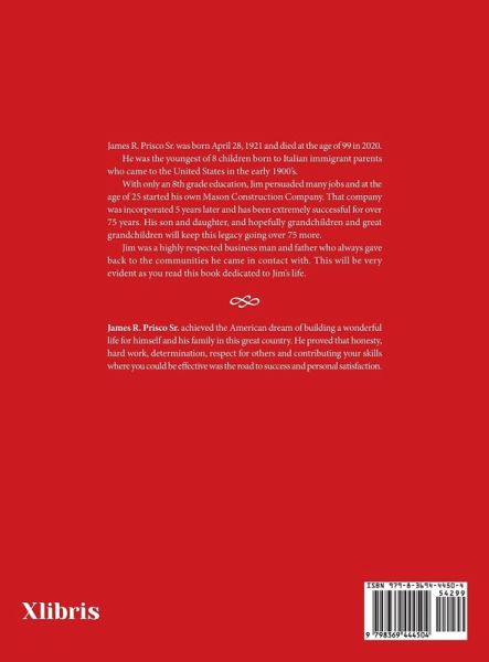 James R. Prisco Sr. was born April 28, 1921 and died at the age of 99 in 2020. He was the youngest of 8 children born to Italian immigrant parents who came to the United States in the early 1900's. With only an 8th grade education, Jim persuaded many jobs and at the age of 25 started his own Mason Construction Company. That company was incorporated 5 years later and has been extremely successful for over 75 years. His son, grandsons and hopefully grandchildren will keep this legacy going over 75 more. Jim was a highly respected business man and father who always gave back to the communities he came in contact with. This will be very evident as you read this book dedicated to Jim's life.