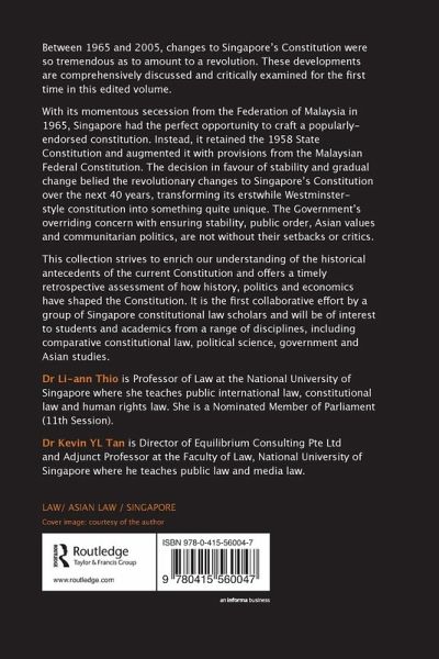 Introduction: Time for a Revolution 1. The Passage of a Generation: Revisiting the Report of the 1966 Constitutional Commission 2. State and Institution Building through the Singapore Constitution 1965-2005 3. Constitutional Jurisprudence: Beyond Supreme Law - A Law Higher Still? 4. Comparative Law and Constitutional Interpretation in Singapore: Insights from Constitutional Theory 5. Constitutional Supremacy: Still a Little Dicey 6. Protecting Rights 7. The Protection of Minorities and the Constitution: A Judicious Balance 8. Constitutionalism and Subversion - An Exploration 9. Writing the Constitution: 40 Years of Singapore Constitutional Scholarship 10. In Search of the Singapore Constitution: Retrospect and Prospect