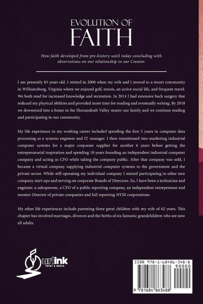 I am presently 85 years old. I retired in 2000 when my wife and I moved to a resort community in Williamsburg, Virginia where we enjoyed golf, tennis, an active social life, and frequent travel. We both read for increased knowledge and recreation. In 2014 I had extensive back surgery that reduced my physical abilities and provided more time for reading and eventually writing. By 2018 we downsized into a home in the Shenandoah Valley nearer our family and we continue reading and participating in our community. My life experience in my working career included spending the first 5 years in computer data processing as a systems engineer and IT manager. I then transitioned into marketing industrial computer systems for a major corporate supplier for another 6 years before getting the entrepreneurial inspiration and spending 10 years founding an independent industrial computer company and acting as CFO while taking the company public. After that company was sold, I became a virtual company supplying industrial computer systems to the government and the private sector. While still operating my individual company I started participating in other new company start-ups and serving on corporate Boards of Directors. So, I have been a technician and engineer, a salesperson, a CFO of a public reporting company, an independent entrepreneur and mentor-Director of private companies and full reporting NYSE corporations. My other life experiences include parenting three great children with my wife of 62 years. This chapter has involved marriages, divorces and the births of six fantastic grandchildren who are now all adults.