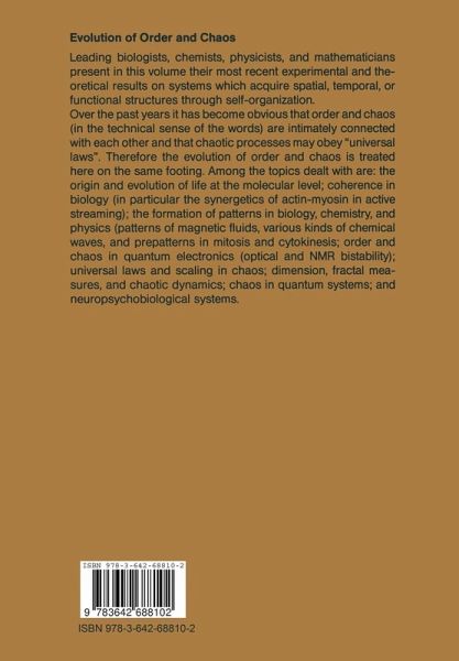 I Introduction.- Introductory Remarks.- II Evolution.- Ursprung und Evolution des Lebens auf molekularer Ebene.- III Coherence in Biology.- The Crystallization and Selection of Dynamical Order in the Evolution of Metazoan Gene Regulation.- The Synergetics of Actin-Myosin in Active Streaming and Muscle Contraction.- IV Instabilities and Pattern Formation in Physics, Chemistry, and Biology.- Pattern Formation in Magnetic Fluids.- Thermoelastic Instabilities in Metals.- Spatial Chemical Structures, Chemical Waves. A Review.- Spontaneous Biological Pattern Formation in the Three Dimensional Sphere. Prepatterns in Mitosis and Cytokinesis.- Generation of Projections in the Developing and Regenerating Nervous System.- V Order and Chaos in Quantum Electronics and Fluids.- Optical Bistability, Self-Pulsing and Higher Order Bifurcations.- Benard Convection and Laser with Saturable Absorber. Oscillations and Chaos.- Bistability and Chaos in NMR Systems.- The Onset of Turbulence in the Wake of an Ion.- VI Order in Chaos.- Diversity and Universality. Spectral Structure of Discrete Time Evolution.- Onset of Chaos in Fluid Dynamics.- Transition to Chaos for Maps with Positive Schwarzian Derivative.- Scaling Properties of Discrete Dynamical Systems.- Phase Transitions in the Homoclinic Regime of Area Preserving Diffeomorphisms.- Noise Scaling of Symbolic Dynamics Entropies.- Dimension, Fractal Measures, and Chaotic Dynamics.- VII Chaos in Quantum Systems.- Cooperative and Chaotic Effects in a Hamiltonian Model of the Free-Electron Laser.- Chaos in Quantum Mechanics.- VIII Emergence of Order or Chaos in Complex Systems.- Criticality and the Emergence of Structure.- Strange Stability in Hierarchically Coupled Neuropsychobiological Systems.- List of Contributors.