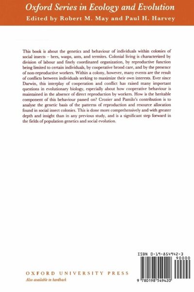Colonial living is characterized by division of labor and finely coordinated organization; however, many events within a colony are the result of conflicts between individuals seeking to maximize their own interests. This interplay of cooperation and conflict has raised many questions in evolutionary biology, especially how cooperative behavior is maintained in the absence of direct reproduction by workers. How, then, is this behavior passed on? Authors Crozier and Pamilo's analyze the genetic basis of the patterns of reproduction and resource allocation found in social insect colonies - bees, wasps, ants, and termites. This comprehensive study has greater depth and insight than any previous work, and is a significant step forward in the fields of social evolution and population genetics.