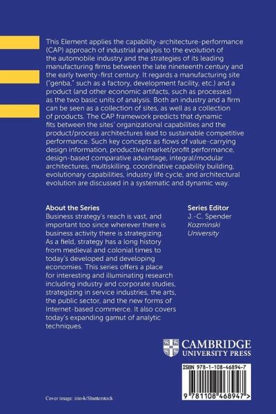 This Element discusses design information, productive/market/profit performance, design-based comparative advantage, integral/modular architectures, multi-skilling, coordinative capability-building, evolutionary capabilities, industry lifecycle, and architectural evolution in the automobile industry.