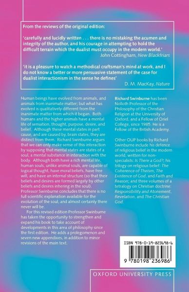 Human beings have evolved from animals, and animals from inanimate matter; but what has evolved is qualitatively different from the inanimate matter from which it began. Both humans and the higher animals have a mental life of sensation, thought, purpose, desire, and belief. Although these mental states in part cause, and are caused by, brain states, they are distinct from them. Richard Swinburne argues that we can only make sense of this interaction by supposing that mental states are states of a soul, a mental substance in interaction with the body. Although both have a rich mental life, human souls, unlike animal souls, are capable of logical thought, have moral beliefs, have free will, and have an internal structure (so that their beliefs and desires are formed largely by other beliefs and desires inhering in the soul). Professor Swinburne concludes that there is no full scientific explanation available for the evolution of the soul, and almost certainly there never will be.