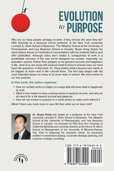 Many never find happiness at work. Will you? Why are so many people unhappy at work, if they choose the work they do? After teaching as a business school professor at the New York University Leonard N. Stern School of Business, The Wharton School at the University of Pennsylvania, and Ivey Business School in Canada, Bryan Hong shares his observations based on hundreds of conversations with his students before and after graduation. Although many don't realize it, unhappiness at work is a consequence of the way we've designed our society, especially our education system. Rather than prepare us for genuine success and happiness in life, most of us are never told what we need to know to answer even our most basic life questions. In this book, Dr. Hong shares what everyone who wants to be happier at work-and in life-should know. The first step begins with the most important lesson so many of us never learn in school: We must evolve to our true purpose. In this book, the author explores:How our society works to shape us in ways that will never lead to happiness at work What it truly means to have a strong sense of purpose at work, and why we all need it for a life beyond survival and pleasure How we can evolve to purpose in a world where so many work without it What if there was much more to your life than what you've been told?