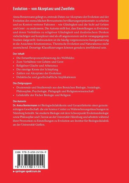 Anna Beniermann gelingt es, erstmals Daten zur Akzeptanz der Evolution und der Evolution des menschlichen Bewusstseins bevölkerungsrepräsentativ zu erheben und im Kontext weiterer Faktoren - wie Gläubigkeit und die Sicht auf Gehirn und Geist -zu analysieren. Die Autorin stellt fest, dass Einstellungen zu Evolution und deren Verhältnis zu religiöser Gläubigkeit und dualistischem Denken vielschichtiger und komplexer sind als oft angenommen und in vorangegangenen Studien dargestellt. Insbesondere ist die häufig vorgenommene Kategorisierung in die Ansichten Kreationismus, Theistische Evolution und Naturalismus nicht ausreichend. Derartige Klassifizierungen können geradezu irreführend sein.