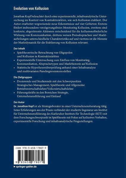 Jonathan Kopf beleuchtet durch eine experimentelle, inhaltsanalytische Untersuchung im Kontext von Kontraktmärkten, wie sich Kollusion etabliert. Der Autor erarbeitet wegweisende neue Erkenntnisse auf vier Gebieten: Erstens fördert insbesondere verzögerungsfreies Monitoring Kollusion, zweitens sind konkrete, abgestimmte Aktionen entscheidend für die kollusionsförderliche Wirkung von Kommunikation, drittens weisen Preisabsprachen und Marktaufteilungen unterschiedliche Charakteristika auf und viertens ist die Historie der Marktdynamik für die Etablierung von Kollusion relevant.