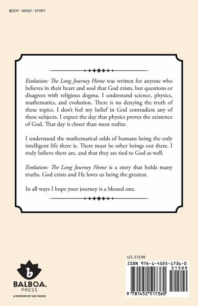 Evolution: The Long Journey Home was written for anyone who believes in their heart and soul that God exists, but questions or disagrees with religious dogma. I understand science, physics, mathematics, and evolution. There is no denying the truth of these topics. I don't feel my belief in God contradicts any of these subjects. I expect the day that physics proves the existence of God. That day is closer than most realize. I understand the mathematical odds of humans being the only intelligent life there is. There must be other beings out there. I truly believe there are, and that they are tied to God as well. Evolution: The Long Journey Home is a story that holds many truths. God exists and He loves us being the greatest. In all ways I hope your journey is a blessed one.