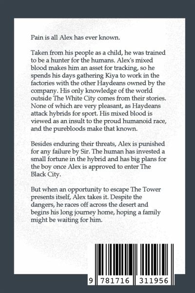 Pain is all Alex has ever known. Taken from his people as a child, he was trained to be a hunter for the humans. Alex's mixed blood makes him an asset for tracking, so he spends his days gathering Kiya to work in the factories with the other Haydeans owned by the company. His only knowledge of the world outside The White City comes from their stories. None of which are very pleasant, as Haydeans attack hybrids for sport. His mixed blood is viewed as an insult to the proud humanoid race, and the purebloods make that known. Besides enduring their threats, Alex is punished for any failure by Sir. The human has invested a small fortune in the hybrid and has big plans for the boy once Alex is approved to enter The Black City. But when an opportunity to escape The Tower presents itself, Alex takes it. Despite the dangers, he races off across the desert and begins his long journey home, hoping a family might be waiting for him.